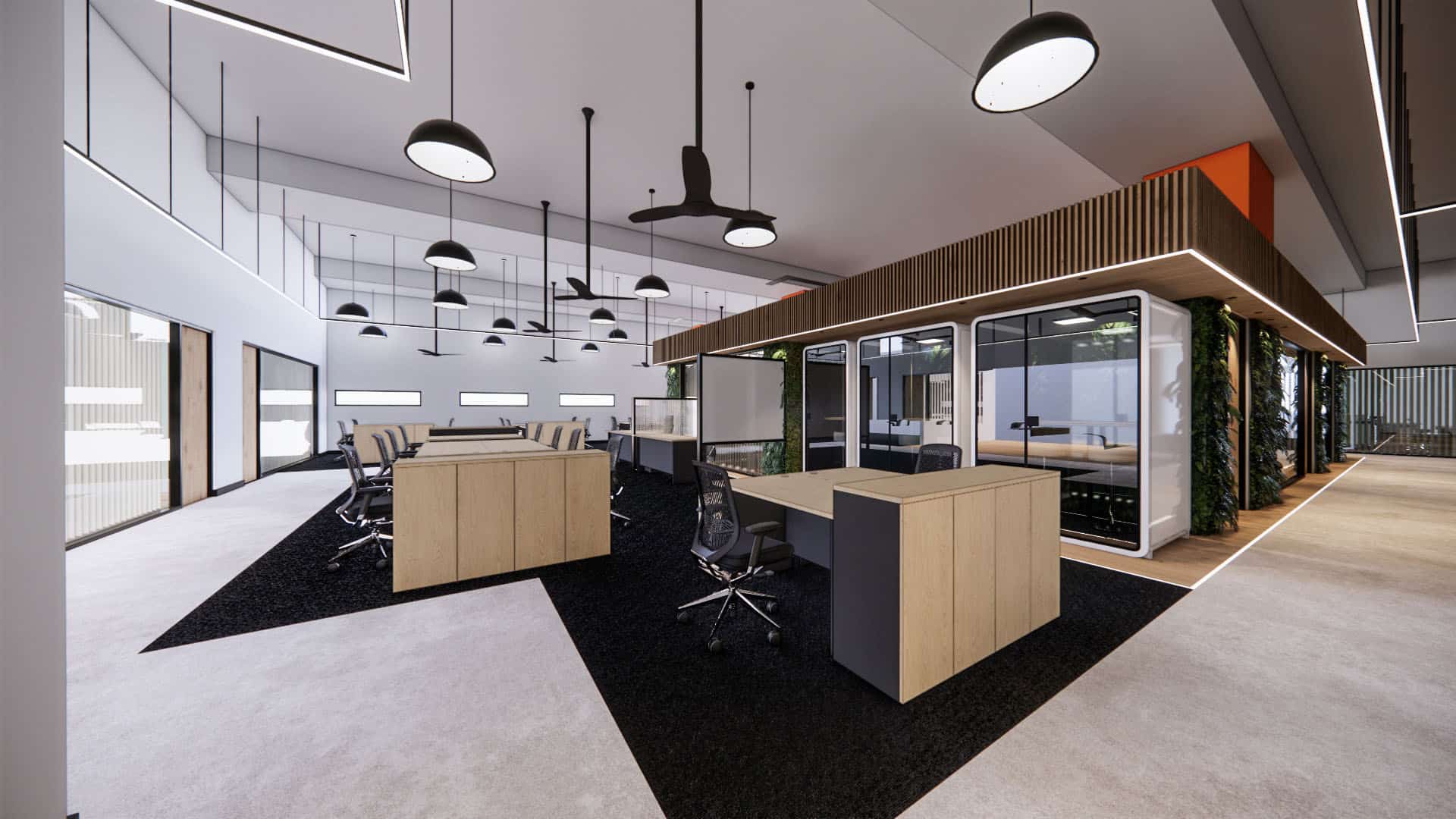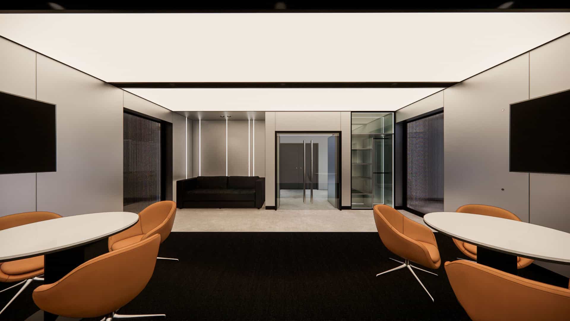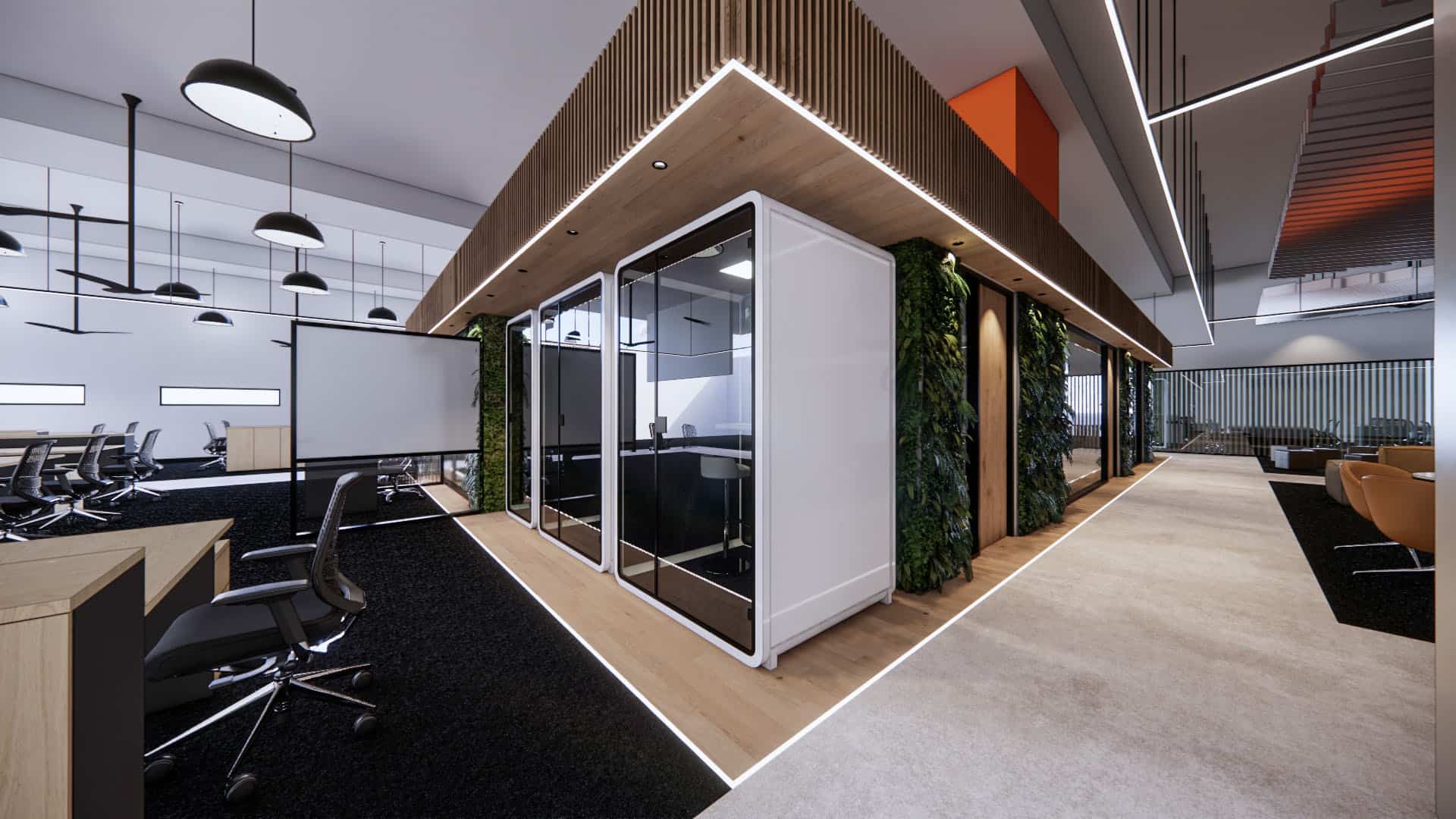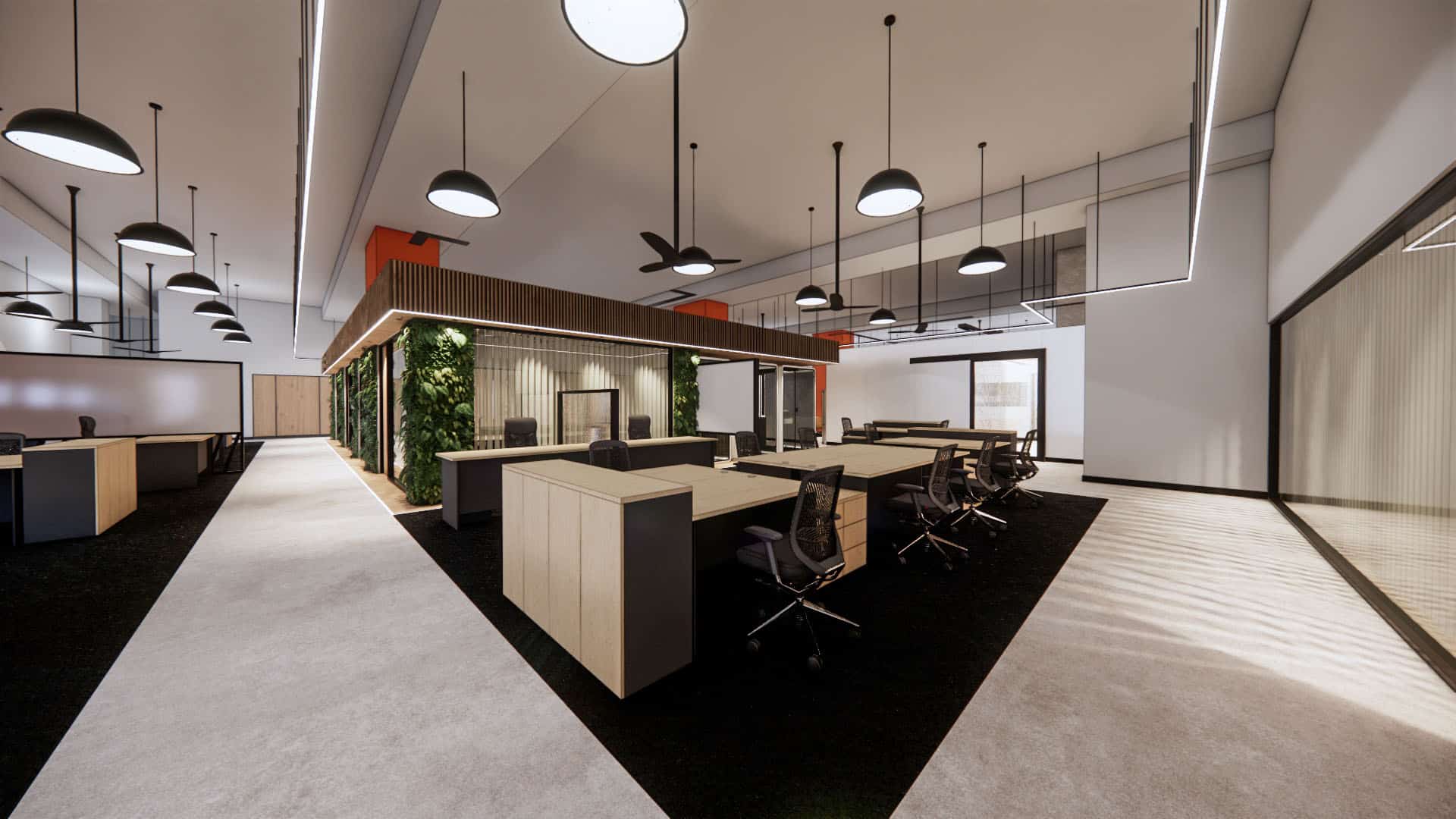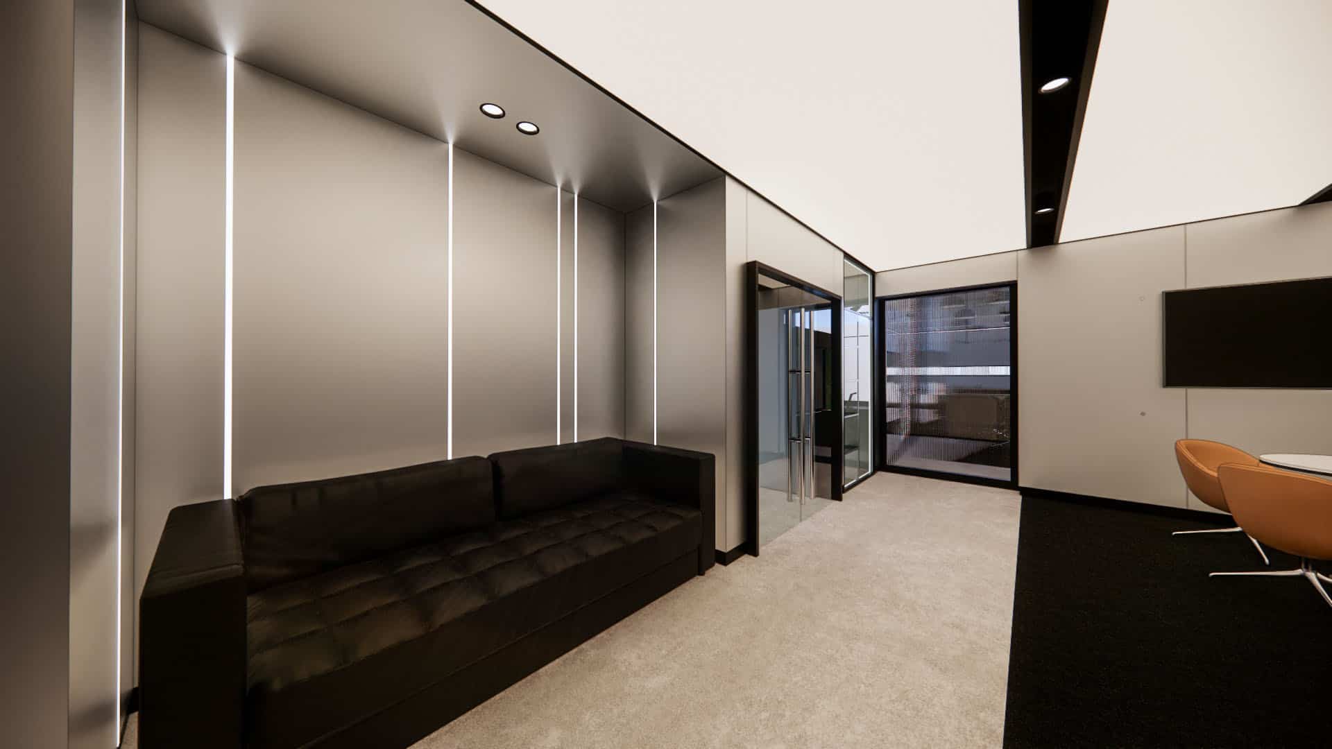 This EV charging service office integrates sleek black finishes, cool steel feature walls, and advanced lighting with a central green spine and warm timber accents. The design balances innovation and nature, reinforcing the company’s commitment to sustainability, efficiency, and a progressive workplace culture.