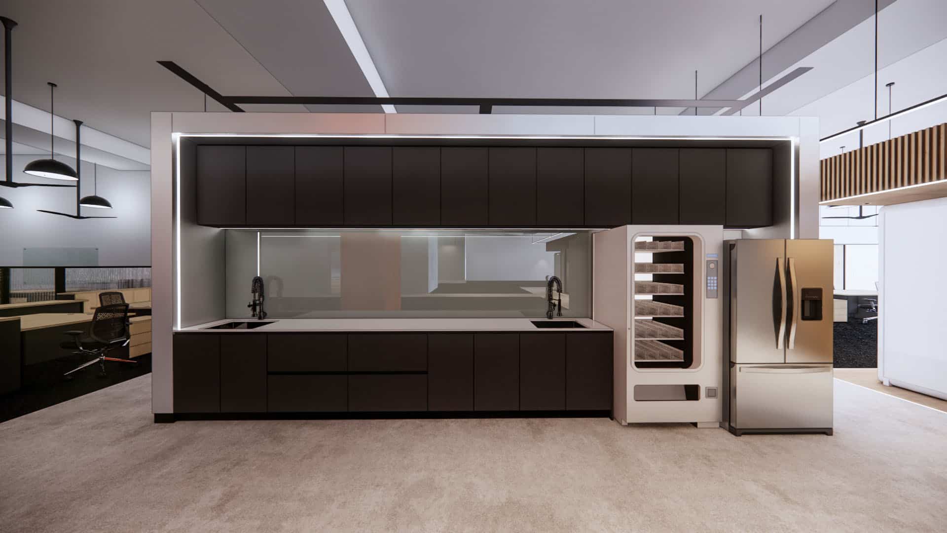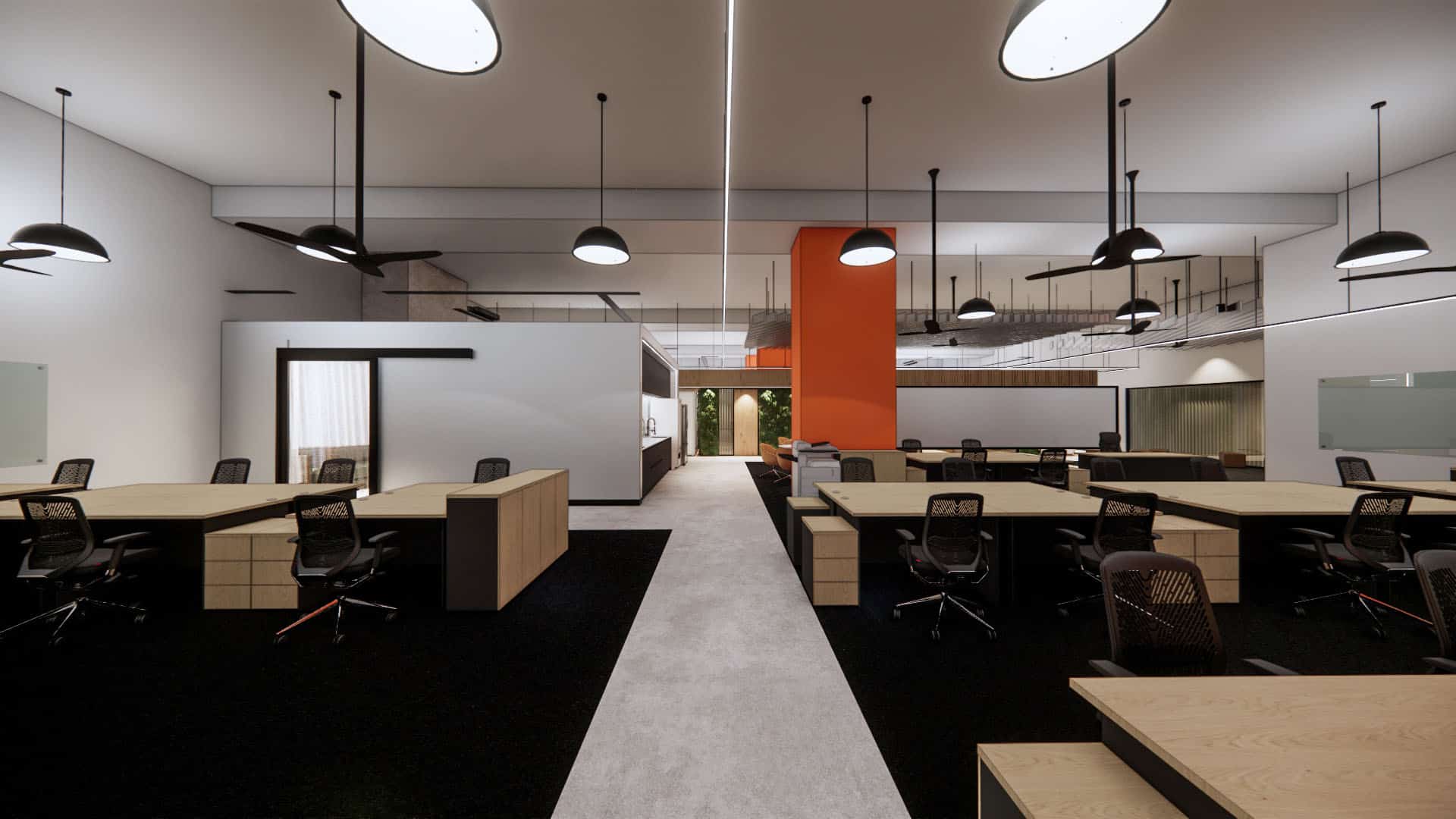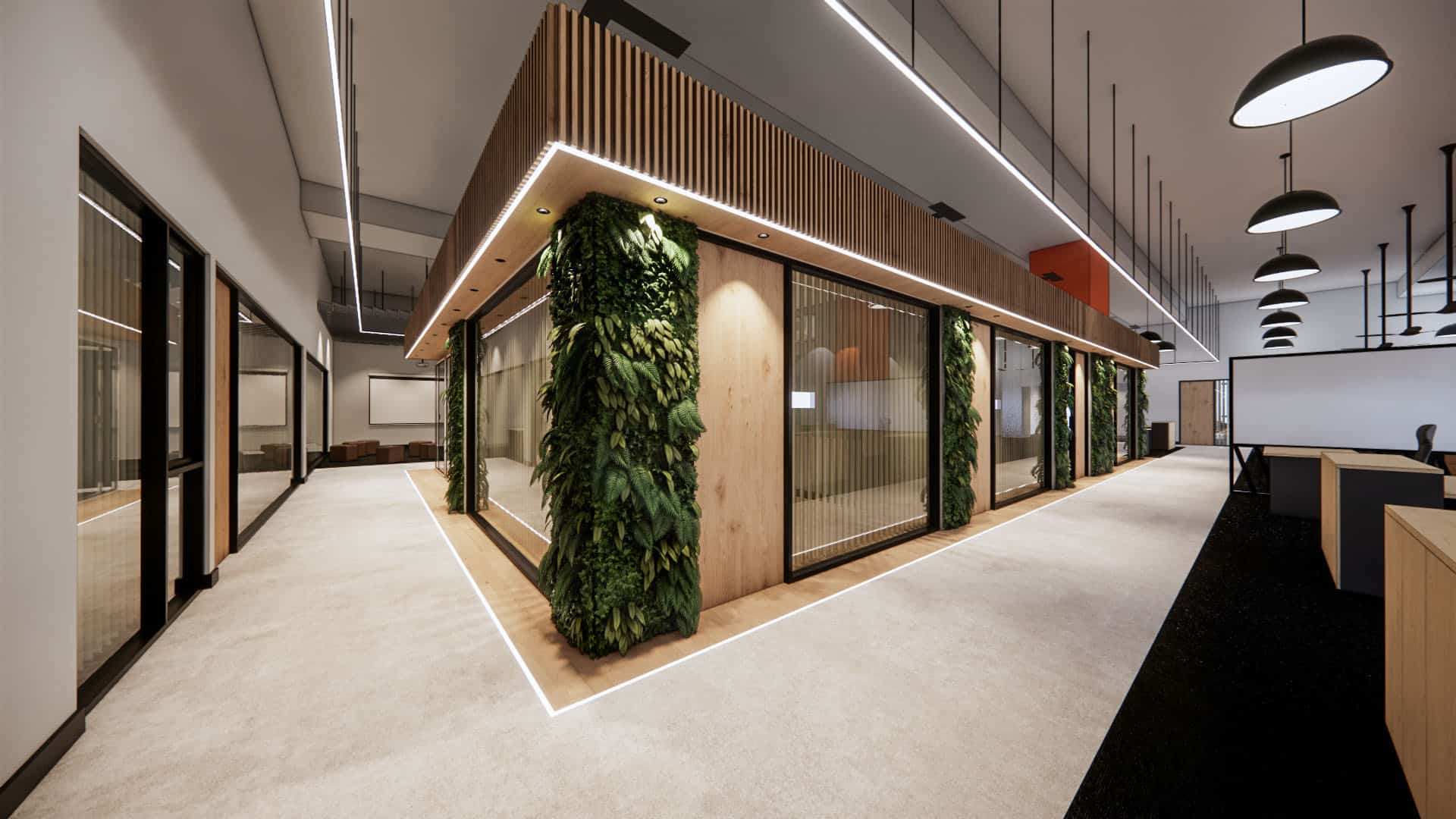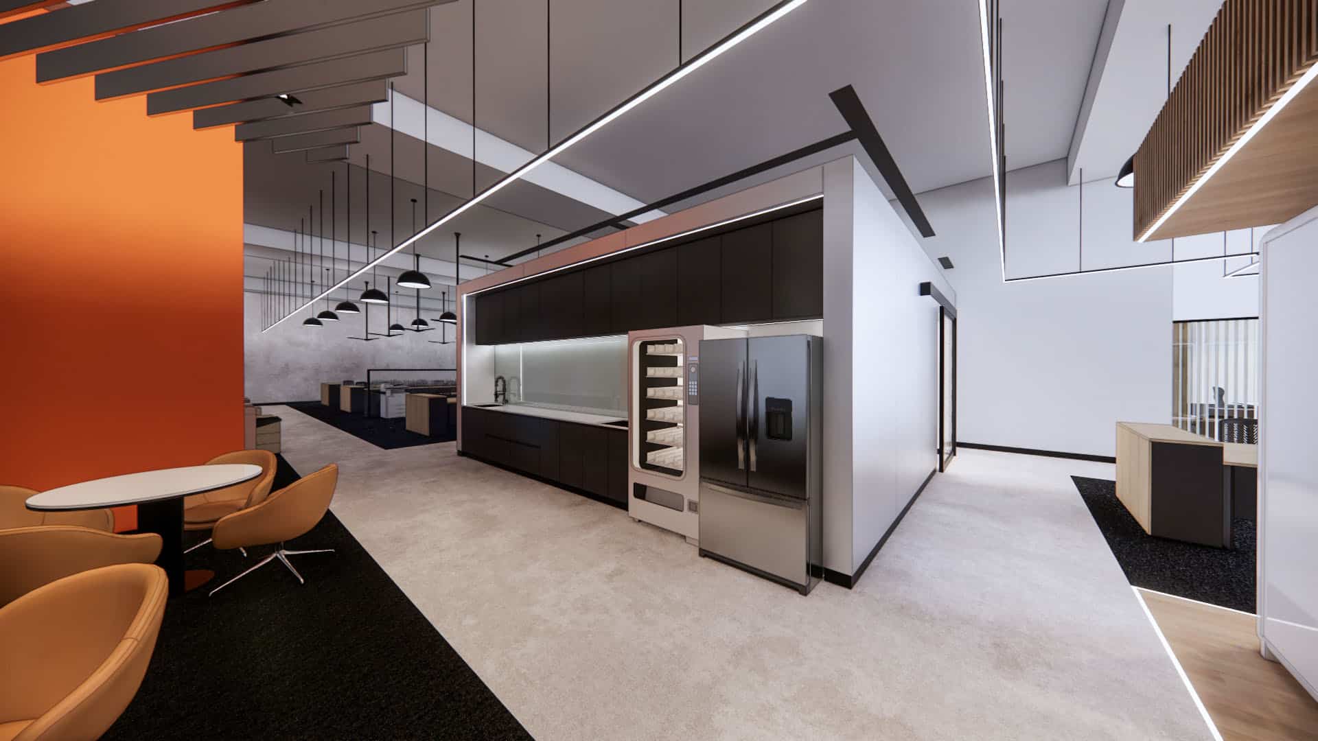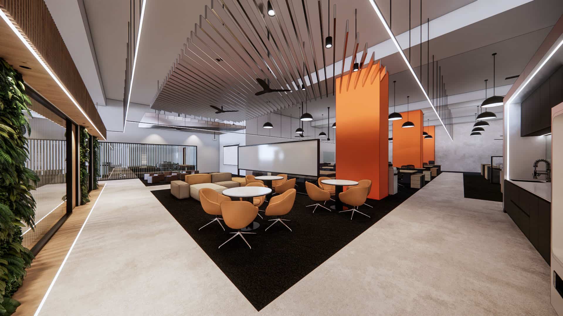 This EV charging service office integrates sleek black finishes, cool steel feature walls, and advanced lighting with a central green spine and warm timber accents. The design balances innovation and nature, reinforcing the company’s commitment to sustainability, efficiency, and a progressive workplace culture.