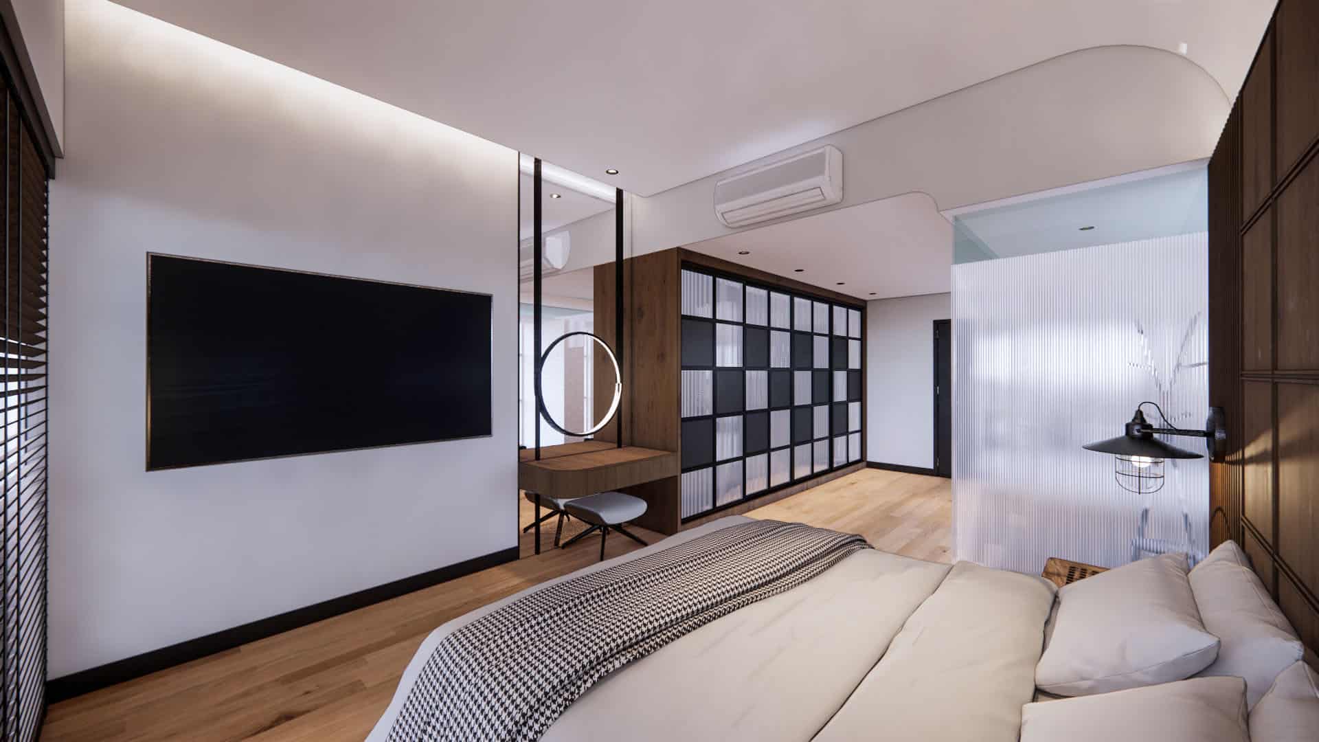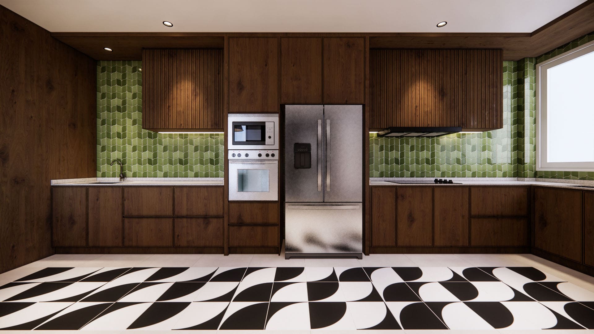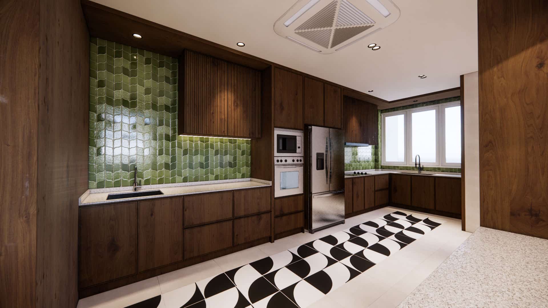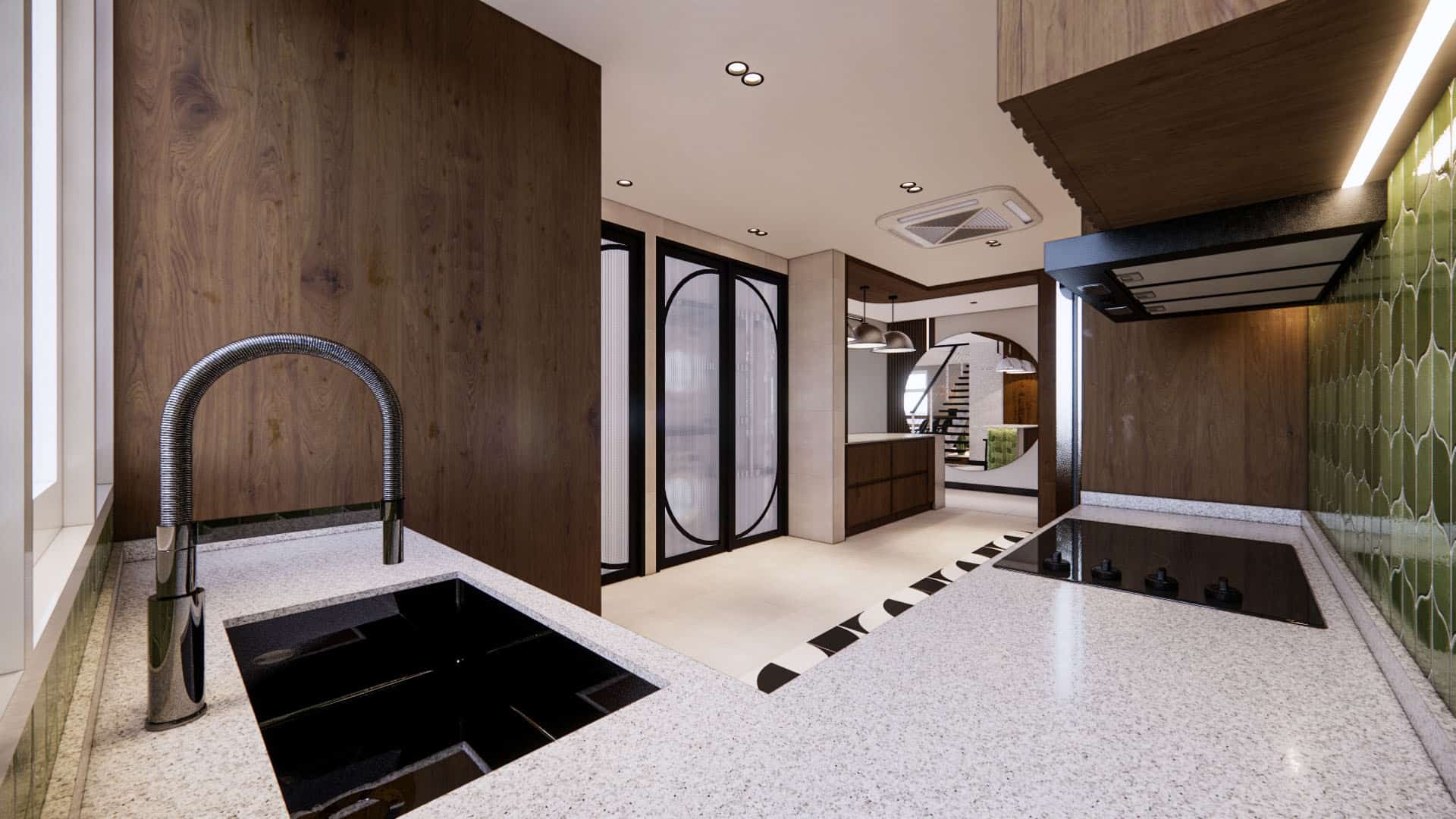 This duplex condo blends contemporary elegance with refreshing greenery and bold green accents. The kitchen features eye-catching green geometric tiles, paired with rich wood cabinetry and monochrome patterned flooring for contrast. A double-volume living room with chandelier and open staircase enhances space, while leafy indoor touches connect the design to nature. Upstairs, a refined study and stylish walk-in wardrobe complete a home where modern sophistication meets lush, vibrant comfort.